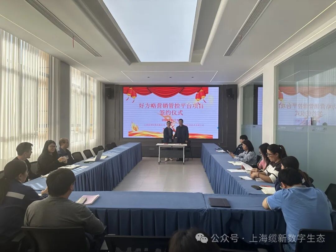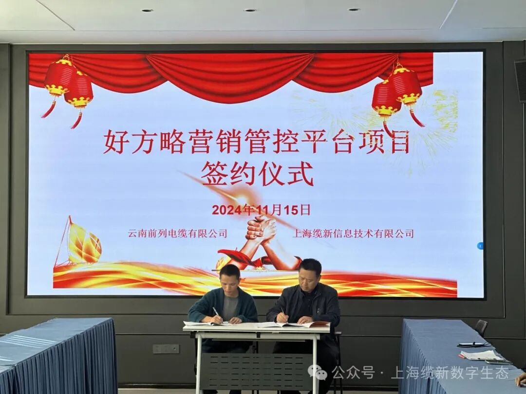 11月15日,云南前列电缆有限公司(以下简称前列电缆)与上海缆新信息技术有限公司就好方略营销报价平台项目合作举行签约仪式,标志着两家企业正式开始营销管控平台项目的合作。